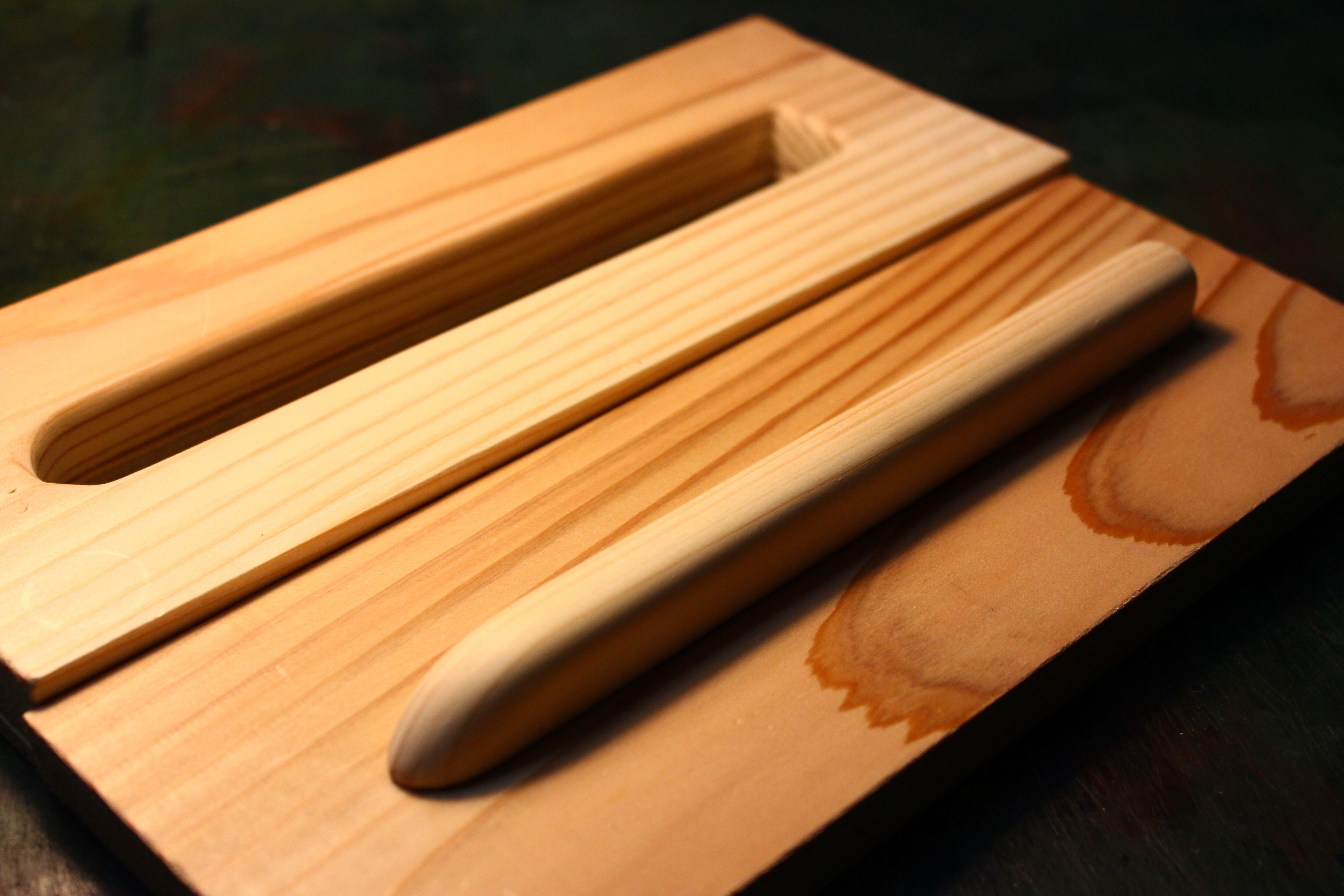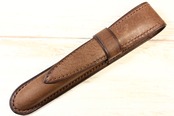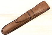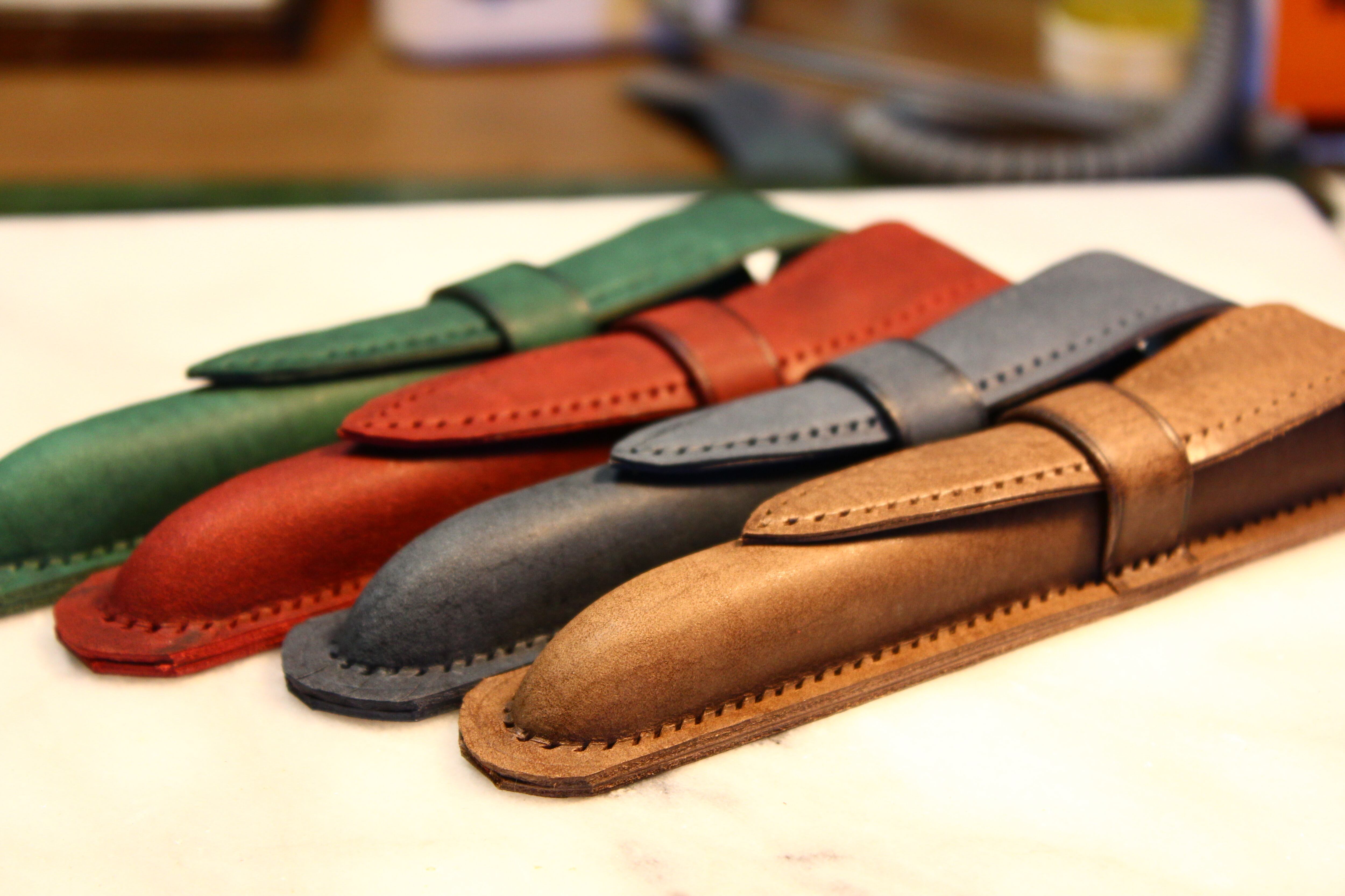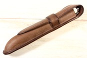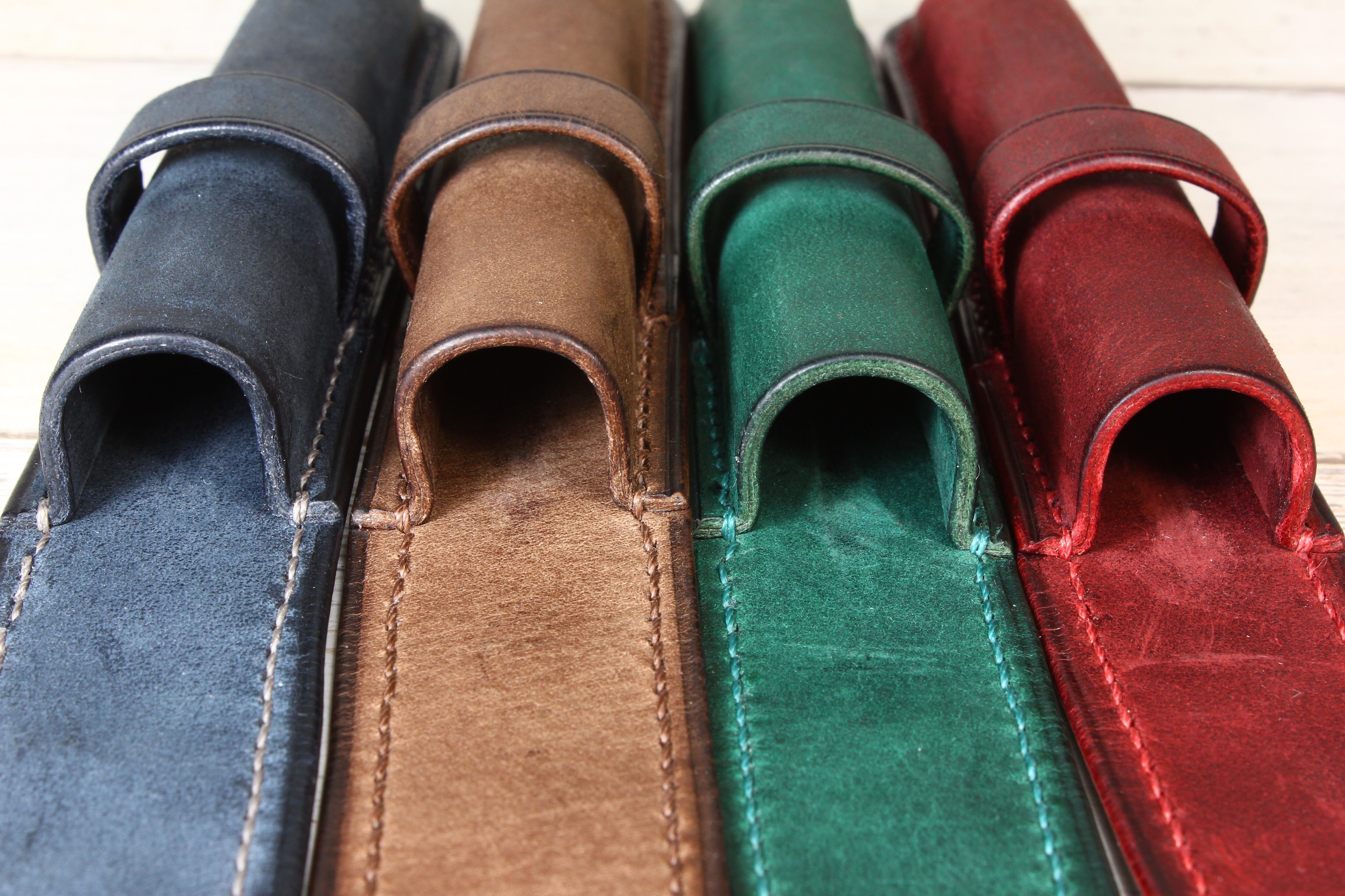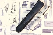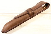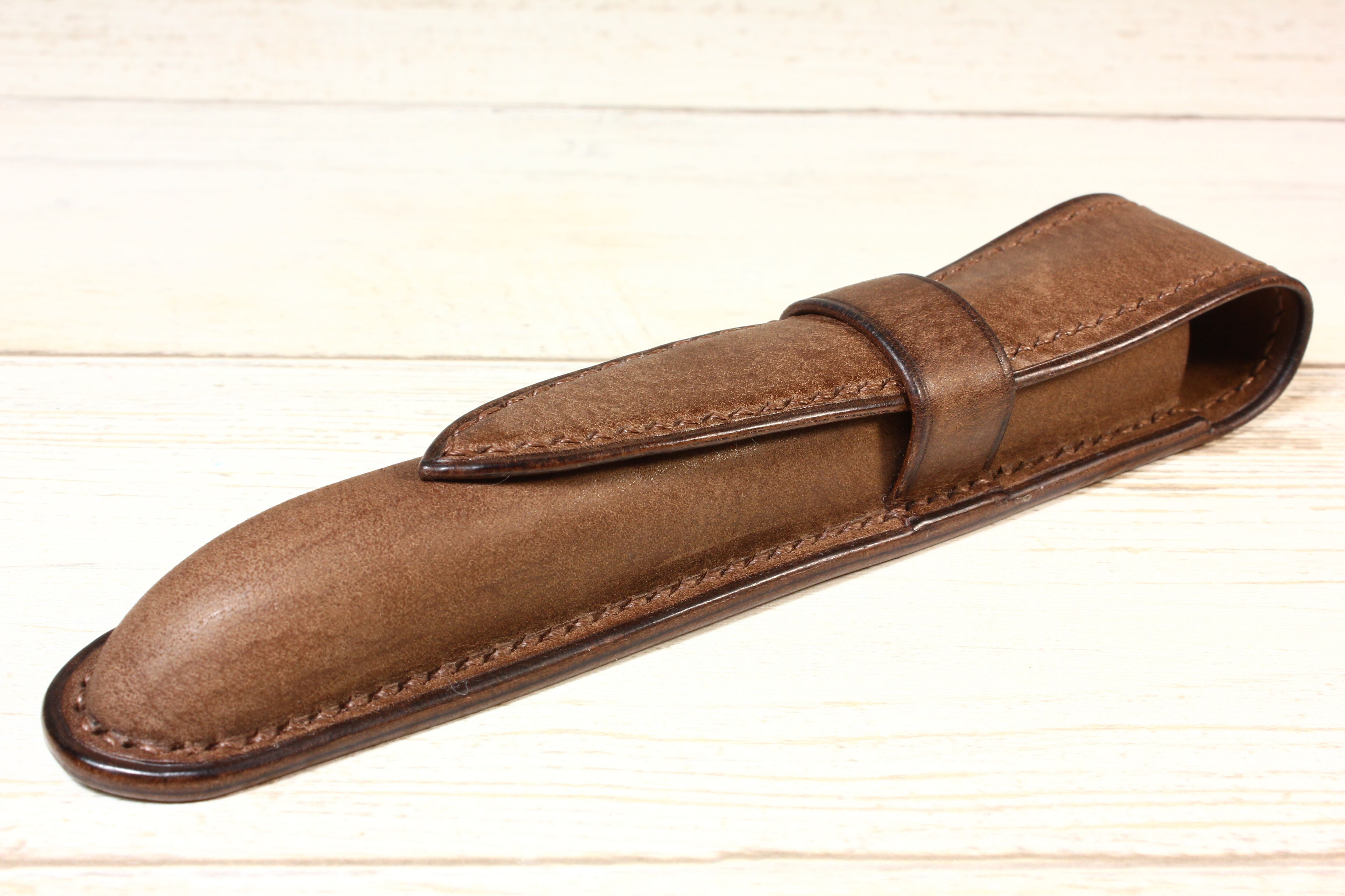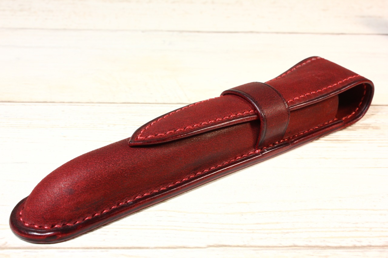 木の枠を自ら作り、革を立体的に形成する絞り技法という伝統的な技術により仕立てた一本差しの万年筆ケースです。