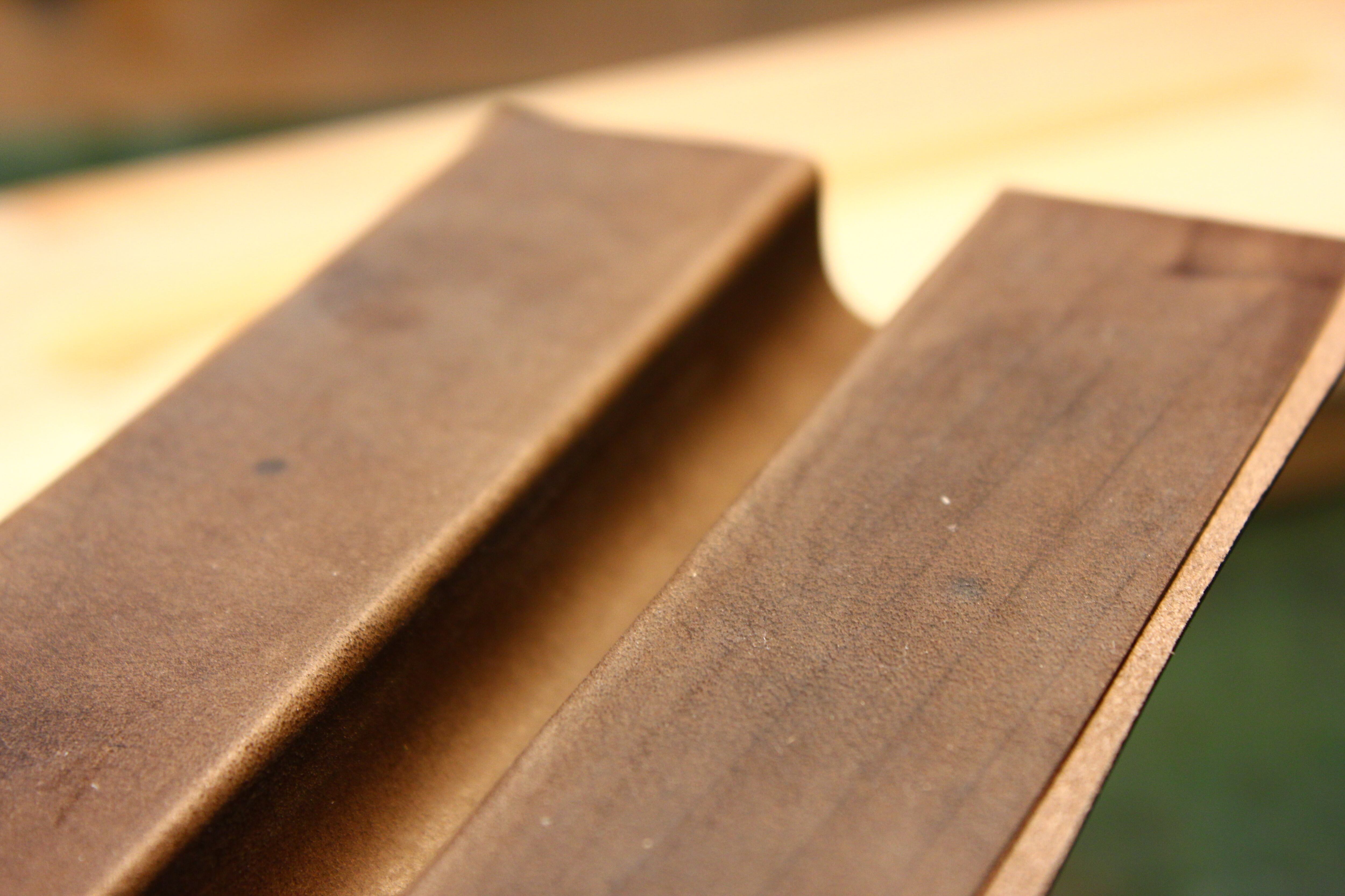 総裏張り、フラップ部分も本体のカーブに沿うように仕立てる段階から成形しています。