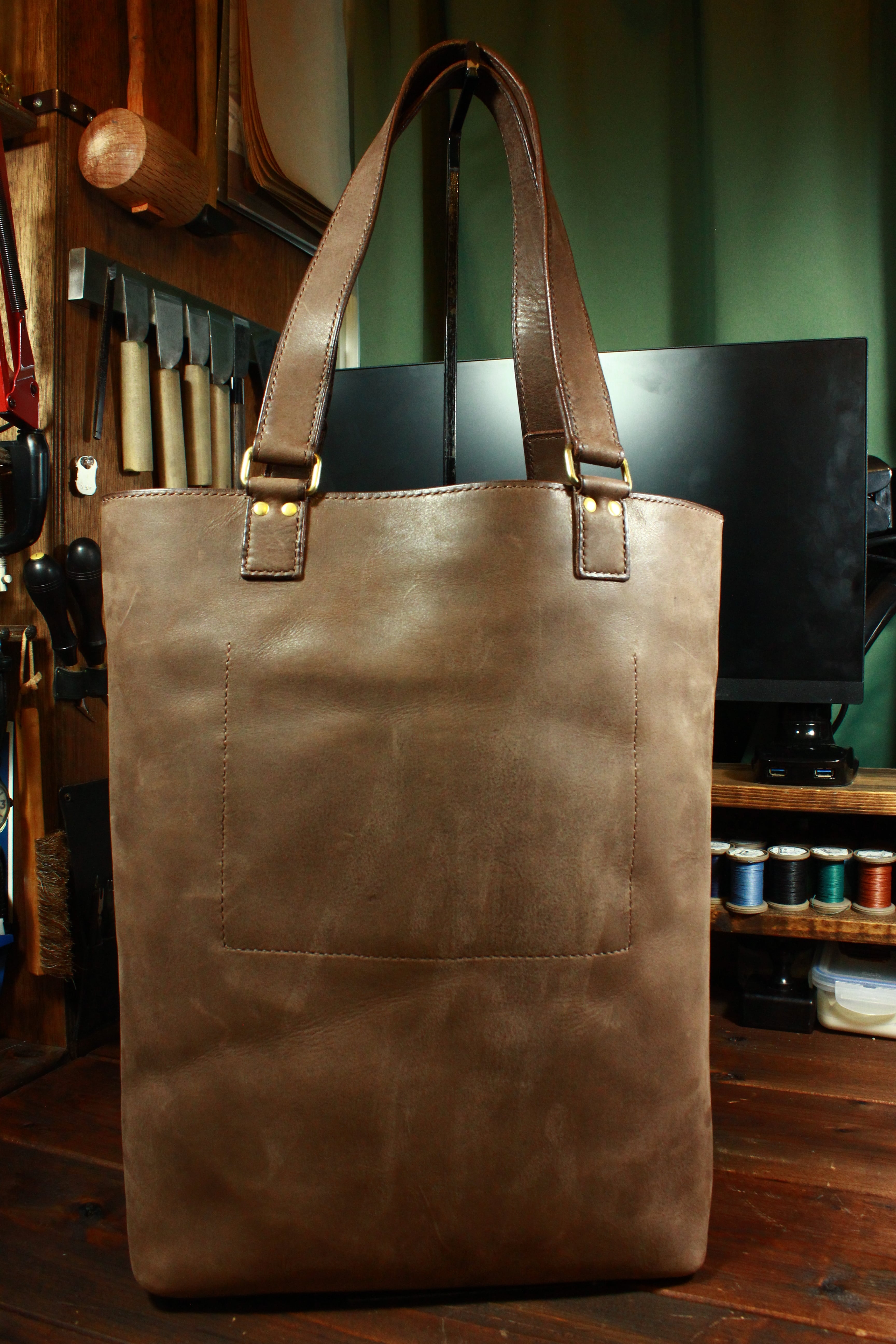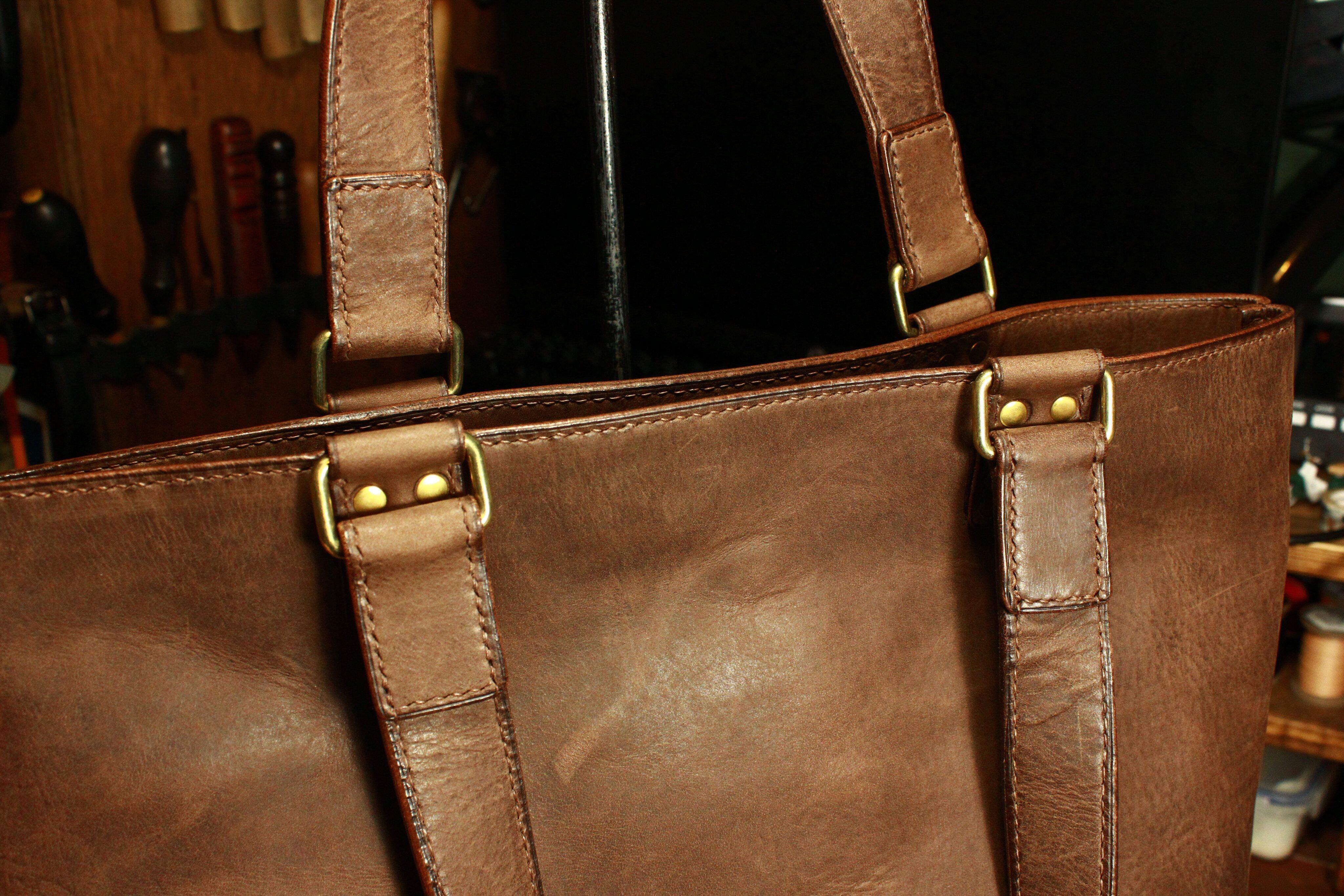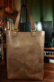 総手縫いの縦型トートバッグ(一枚革仕立て)(サッビアレザー)
